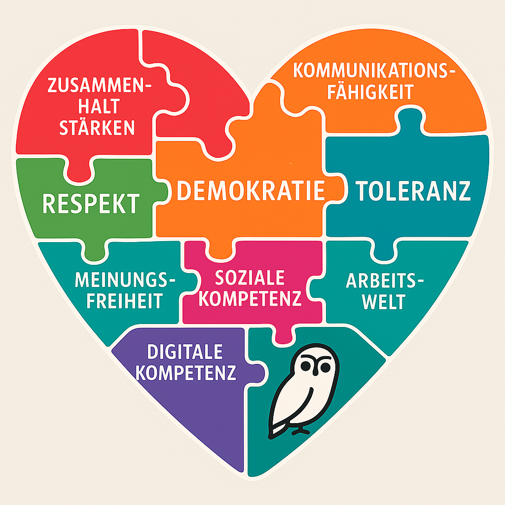 Das Demokratiepuzzle verdeutlicht: Demokratie besteht aus vielen einzelnen Bausteinen – wie Toleranz, Verantwortung, Kritikfähigkeit, Solidarität und Engagement. Diese Kompetenzen fördern wir gezielt im Schulalltag, in Projekten und in der Zusammenarbeit mit Schüler*innen, Eltern und außerschulischen Partnern. Dabei verstehen wir Demokratie als dynamischen Prozess, der durch gemeinsames Handeln und stetige Reflexion wächst.