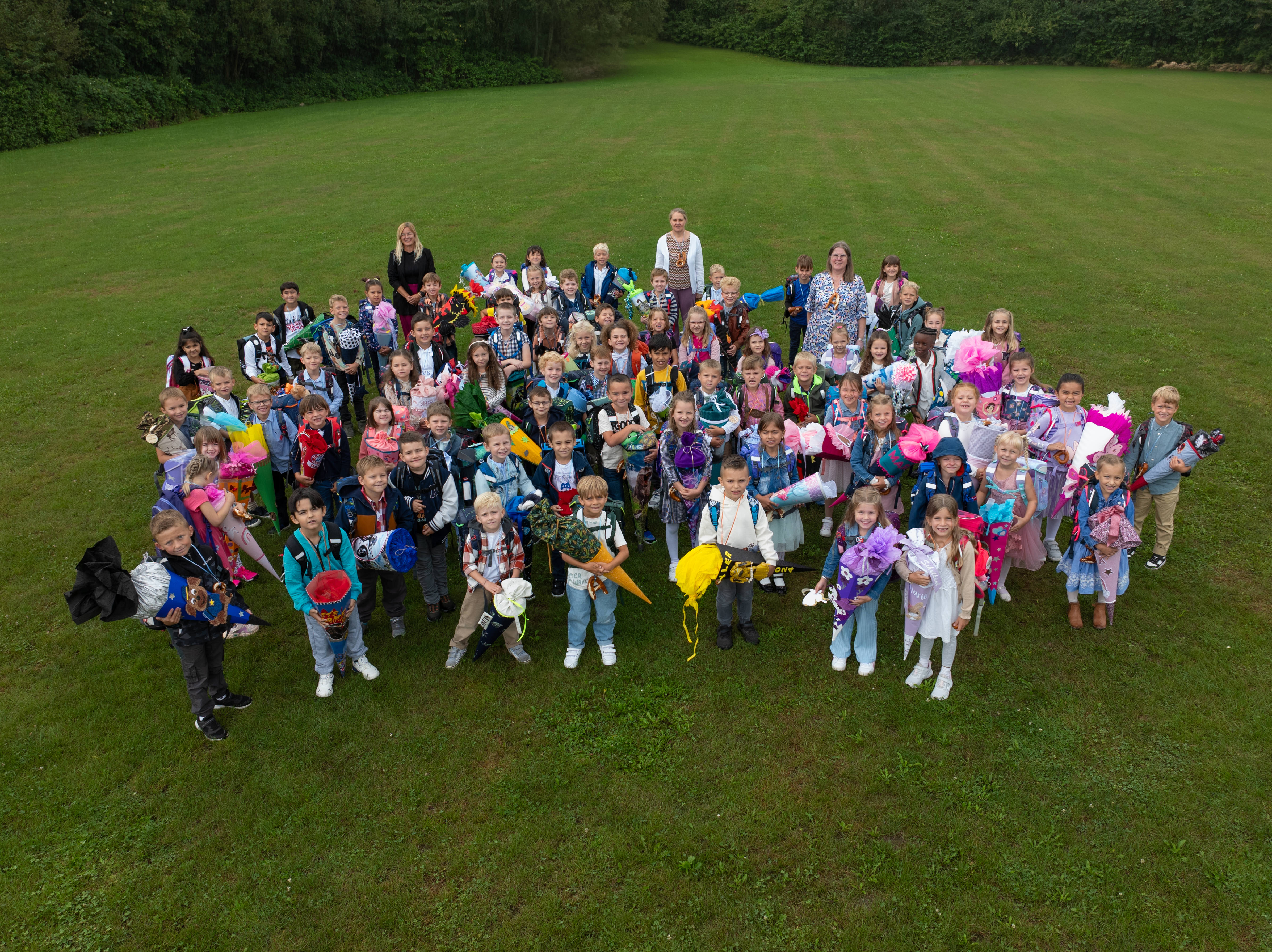Für 74 ABC-Schützen begann am Dienstag der „Ernst des Lebens“ in der Grundschule Velden. Nach der Kindersegnung in der Pfarrkirche hieß Rektorin Sibylle Wallner die neuen Schülerinnen und Schüler und ihre Eltern in der Schulturnhalle herzlich willkommen. Für die musikalische Gestaltung sorgten die Klassen 4a und 4b. Mit den Liedern „Heut ist ein ganz besondrer Tag“ und „Ich geh‘ zur Schule“ stimmten sie die Erstklässler auf ihren ersten Schultag ein. Jeder ABC-Schütze bekam von seiner Lehrerin Marietta Miera (1a), Susanne Boger (1b) und Sabrina Rödig (1c) einen aus Brezelteig gebackenen Buchstaben – entsprechend der Klasse A, B oder C – umgehängt. Trotz einsetzenden Regens wurde anschließend auf dem Sportgelände ein gemeinsames Erinnerungsfoto mit Hilfe einer Drohne aufgenommen, was die Kinder besonders beeindruckte. Nach den einzelnen Klassenfotos ging es für alle Schülerinnen und Schüler zum ersten Mal in ihr Klassenzimmer. Leider war die erste gemeinsame Unterrichtseinheit viel zu schnell vorbei. Nach der Verabschiedung führten die Lehrerinnen ihre Klassen hinunter in die Aula, wo sie von ihren stolzen Eltern in Empfang genommen wurden.
