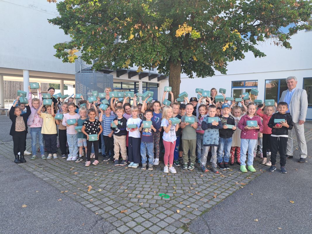 Mit großer Freude wurden die Boxen von den Erstklässlern am Ende der ersten Schulwoche in Empfang genommen. Dazu kam Bürgermeister Ludwig Greimel persönlich in die Schule und verteilte sie an die schon gespannt wartenden Schulanfänger. Im Anschluss daran ließen sich die Kinder den gesunden Inhalt in der Pause gleich schmecken.