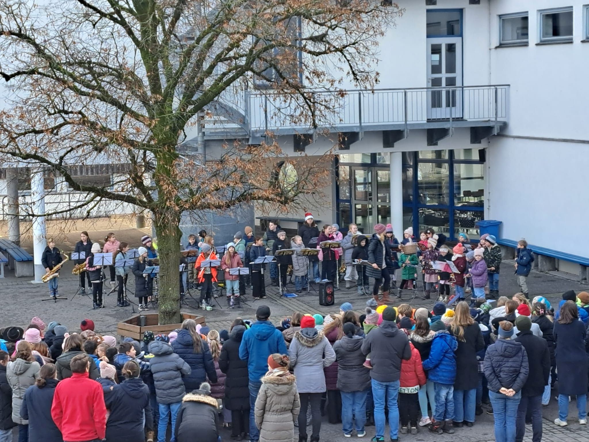 Die Klassen der Grund- und Mittelschule versammelten sich im Pausenhof und lauschten den Klängen ihrer Mitschüler. Die Musiker präsentierten u. a. die Stücke „Lieber, guter Nikolaus“, „Ein Schneemann“, „Bald ist Weihnachten“, „Christbaum, schöner Baum“ und begeisterten das Publikum mit traditionellen Weihnachtsliedern wie „Jingle bells“, „Stille, stille, kein Geräusch gemacht“ und „Morgen kommt der Weihnachtsmann“.
