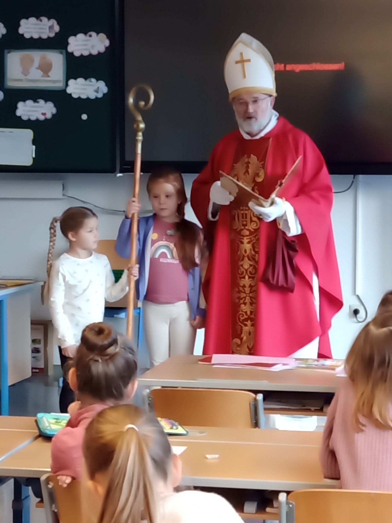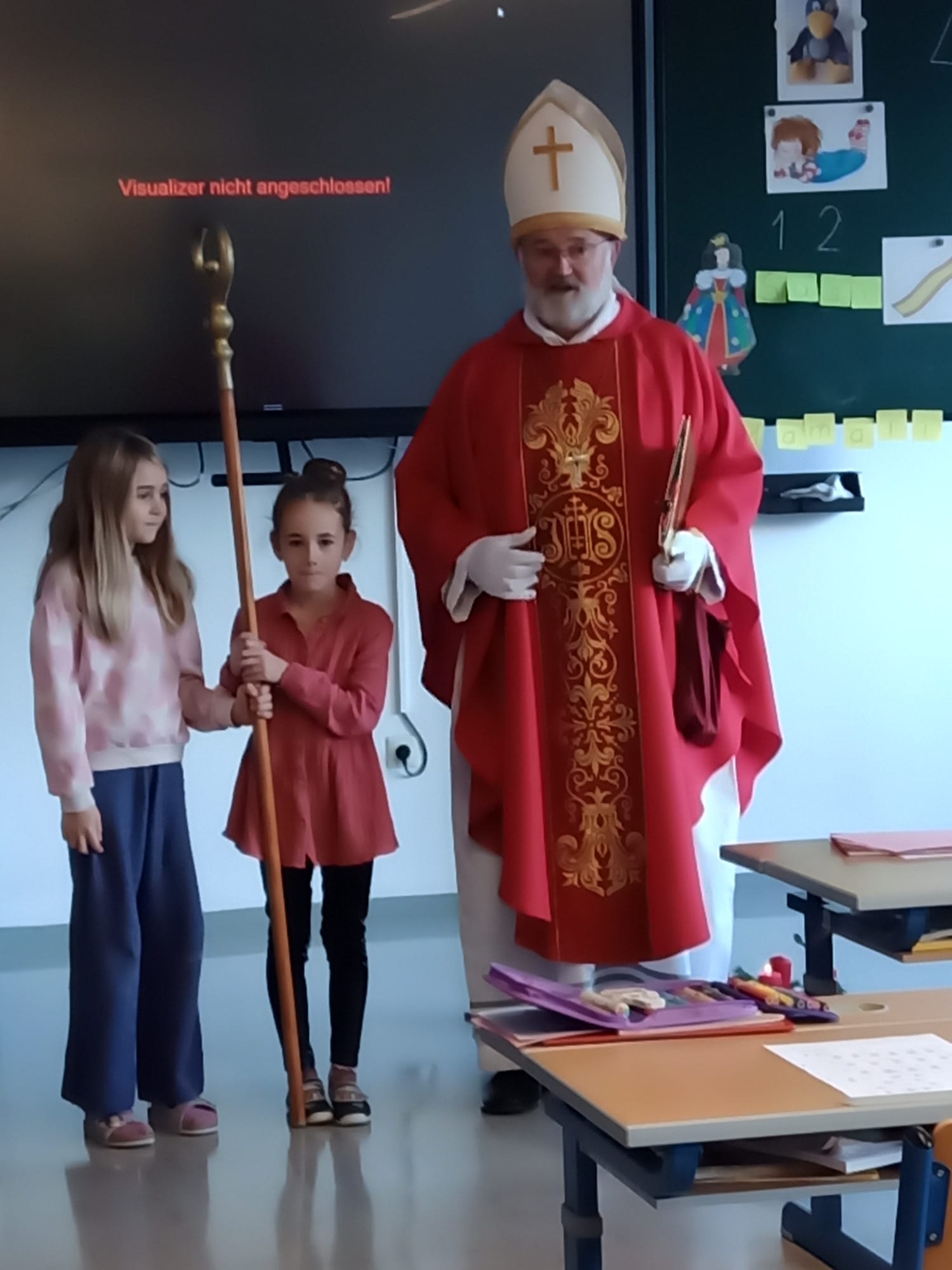 Zuerst fragte er die Kinder, woran sie ihn erkannt hätten. Fleißig nannten sie die Merkmale: Bischofsstab, Ring, Mantel und Bischofsmütze. Der Nikolaus war beeindruckt, dass die Kinder sogar den Fachbegriff Mitra aus dem Religionsunterricht kannten.