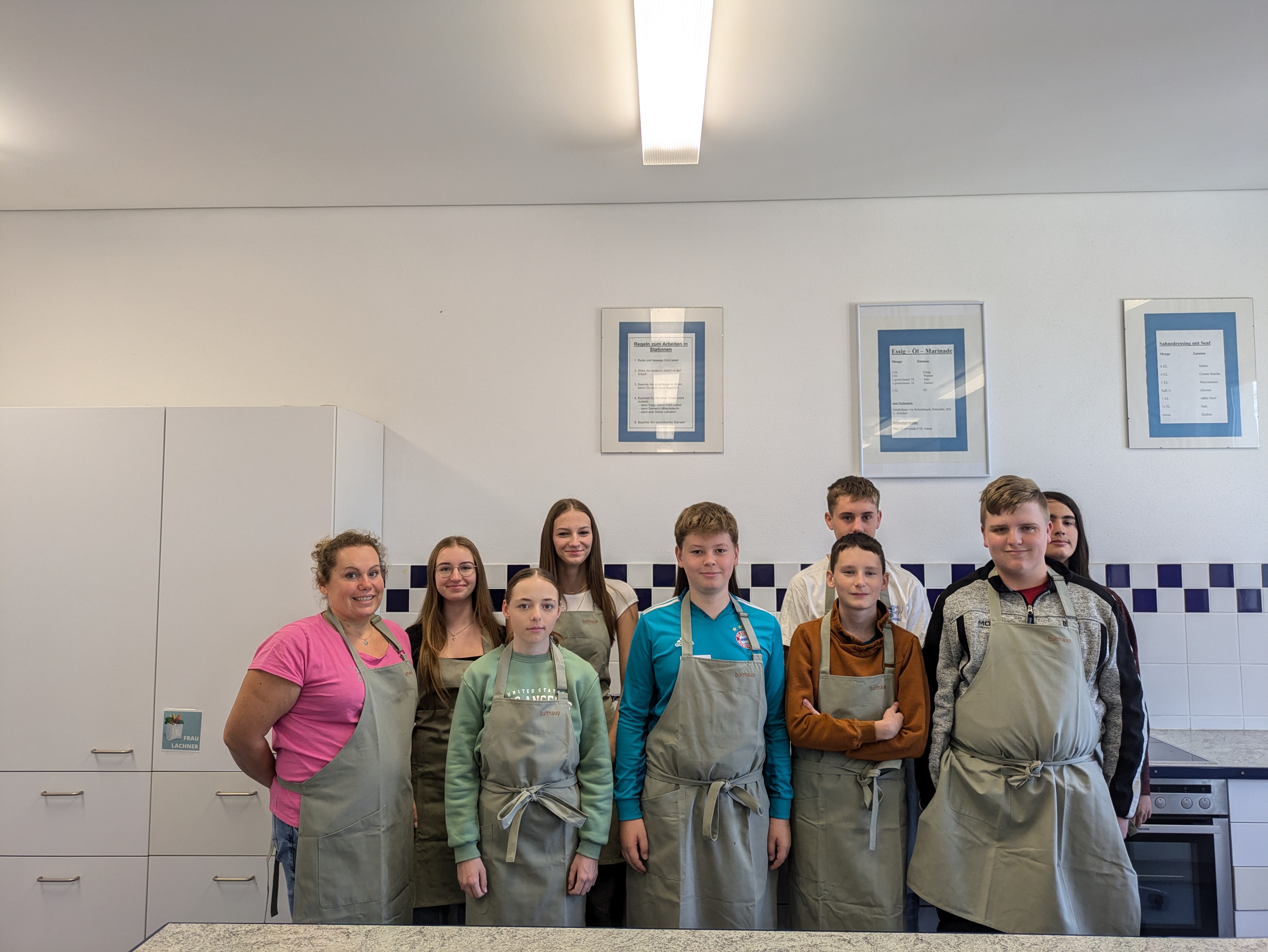 Fachoberlehrerin Rosemarie Lachner und ihre Schülerinnen und Schüler bedanken sich sehr herzlich beim Unternehmen bulthaup Küchen, Bodenkirchen für die gespendeten Schürzen.